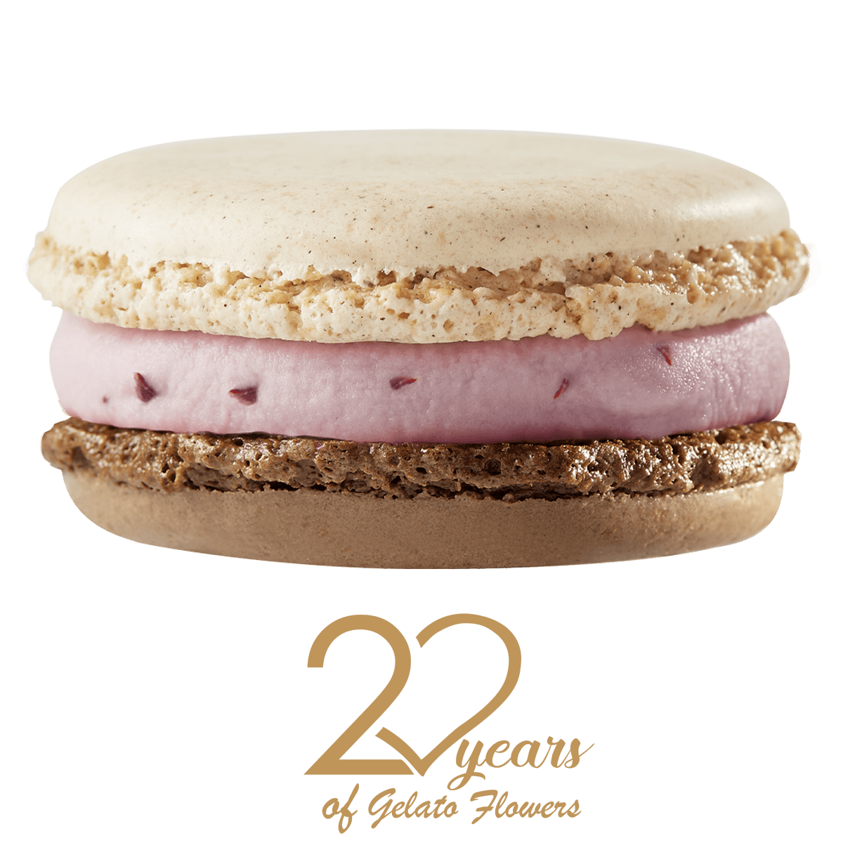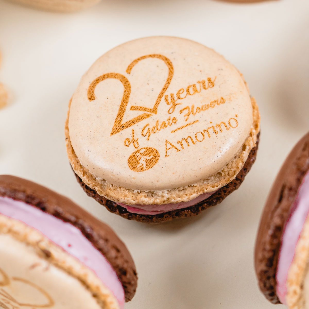 Our limited edition Amarenada flavor is also available in a decadent Grandioso Macaron proudly decorated with the Amorino 20-year anniversary logo.