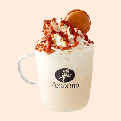 Una deliziosa cioccolata bianca con aggiunta di panna montata, topping al caramello e decorata con scaglie di caramello. l Macaron bicolore a tema Halloween completerà questa bontà