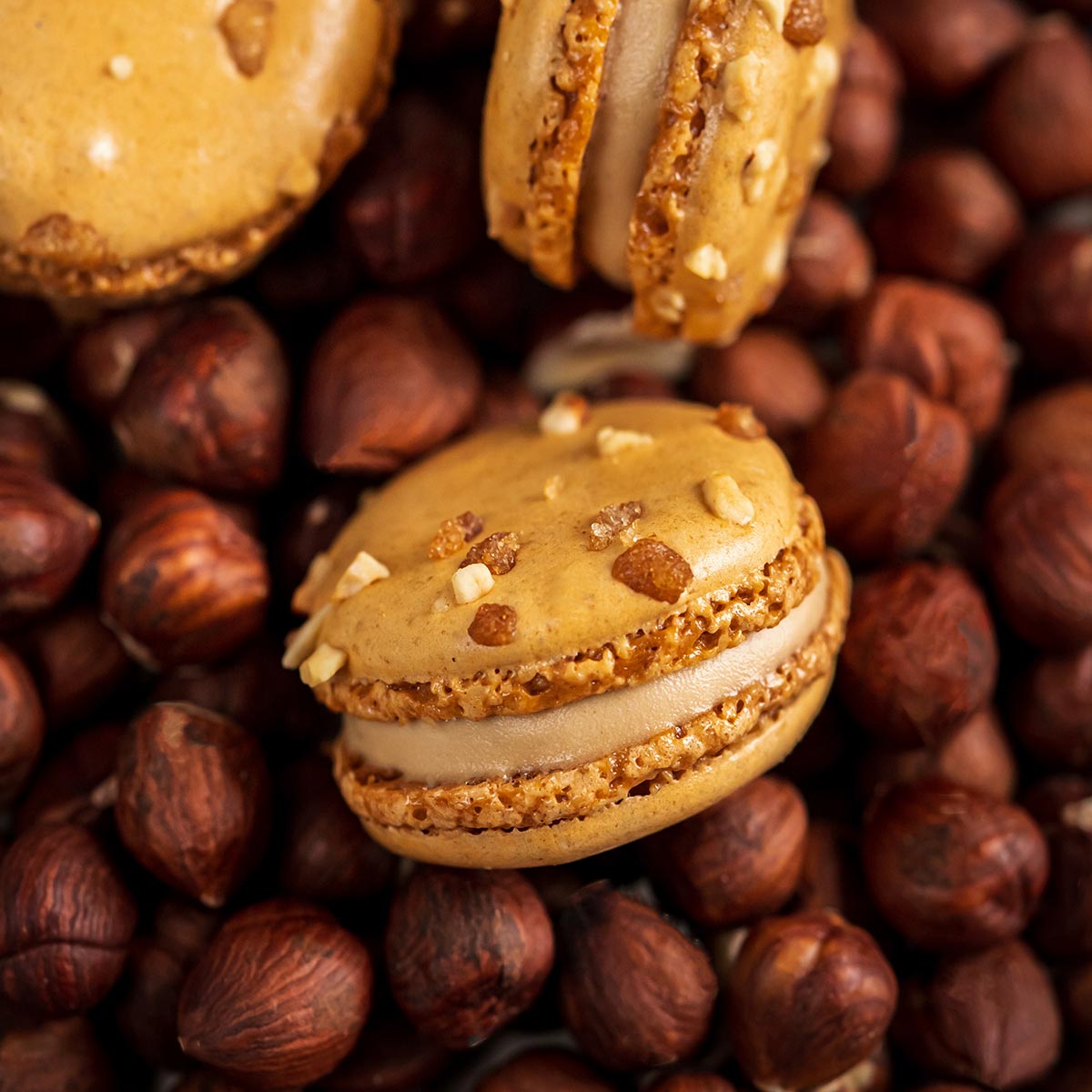 Our intense, classic Hazelnut gelato set like a jewel between two macarons shells covered with Hazelnut pieces!